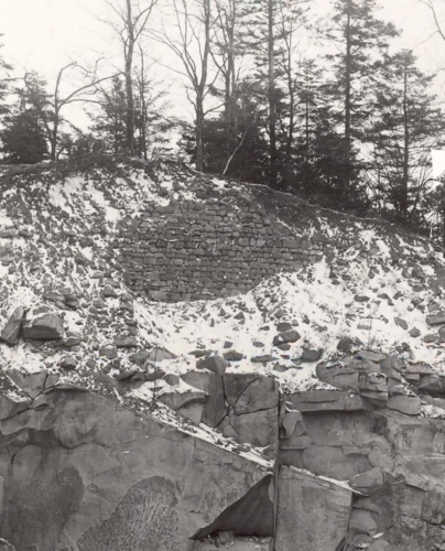 Einen ersten gesicherten Nachweis gab es im Sommer 1943, der auch Peinkofer elektrisierte. Beim Erweitern eines Steinbruchs Richtung Osten stießen die Arbeiter auf Reste der Burg. Peinkofer spricht von einem Turmstumpf aus mächtigen Quadern, einer 20 Meter langen Mauer (siehe Foto) und weiteren Teilen der Burganlage. Ihn faszinierte ein großer romanisch-gotischer Schlüssel. Einen Säbel, Werkzeuge, Kohlen und Schlacke warf man achtlos beiseite.