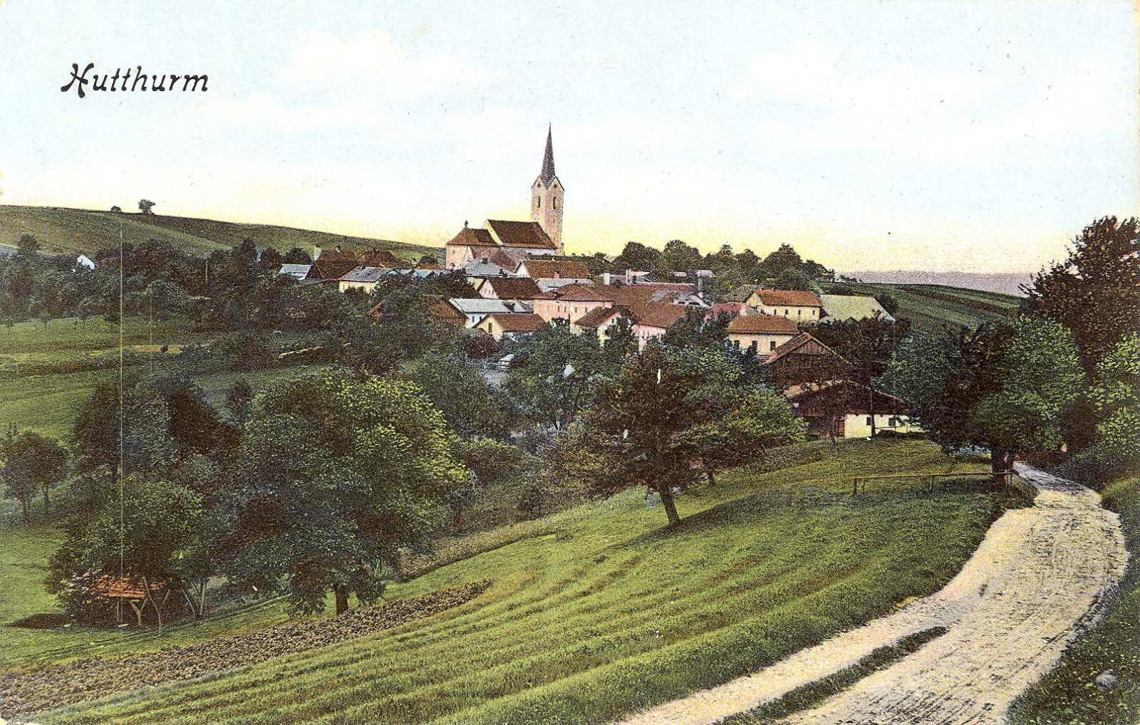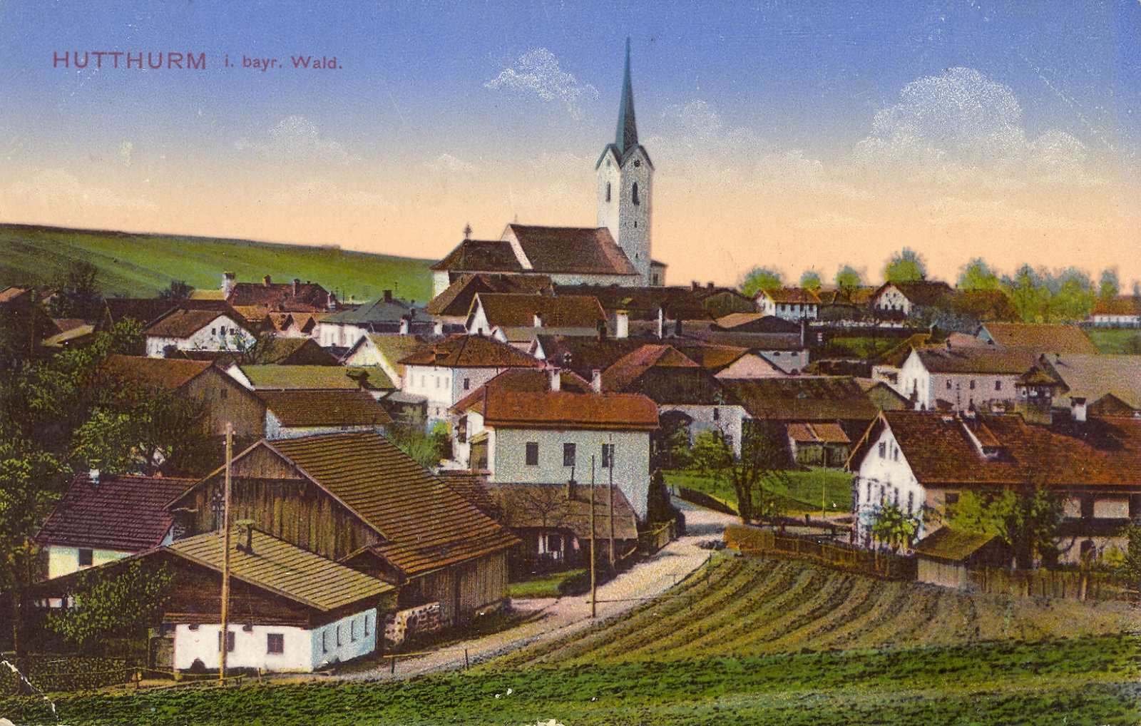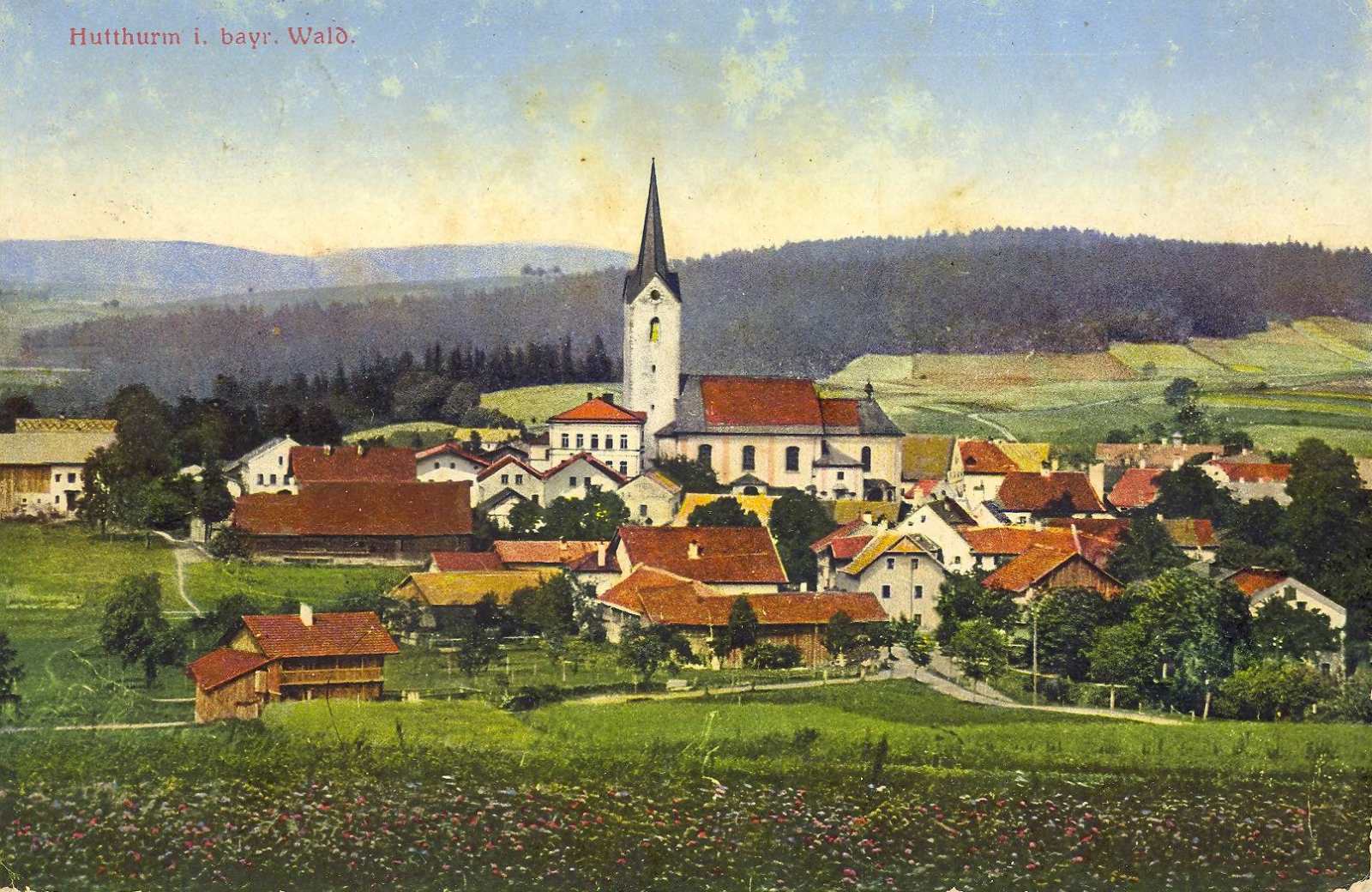 Kalteneck gehört heute zur Marktgemeinde Hutthurm. Auf dem größeren Bild ist die Ilz mit der Straßenbrücke und der Bahnhofseite zu sehen. Die Eisenbahnbrücke für die Linie nach Tittling - Deggendorf war zu dieser Zeit noch nicht gebaut. Auf dem kleineren Bild warten Reisende vor der Restauration auf einen Zug der Linie Passau – Freyung. „Wetter schlecht, Bier recht, an Schatz hab'n, wär auch nicht schlecht“, teilt eine Rosa mit. Die Karte stammt von Hans Schuster, Fotograf.