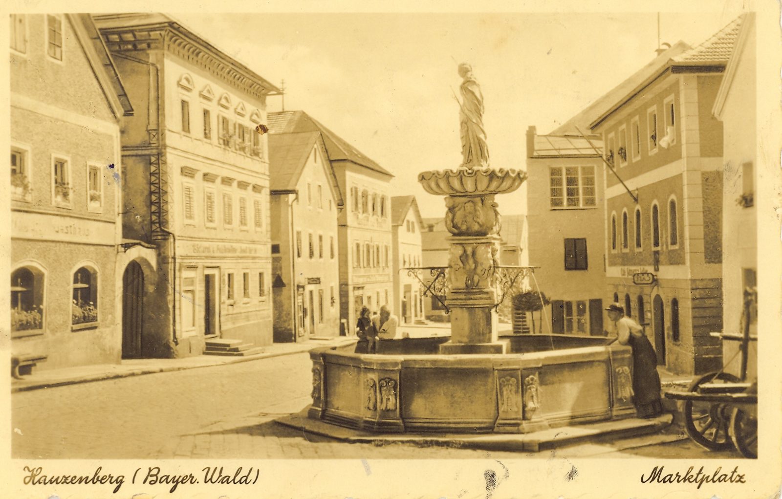Kinder in Sonntagskleidung haben am Marktbrunnen Aufstellung genommen. Bei zwei Buben handelt es sich um Erstkommunikanten. Wie damals üblich, tragen die Buben Hüte. Die Karte erschien im Verlag Zerle, München.