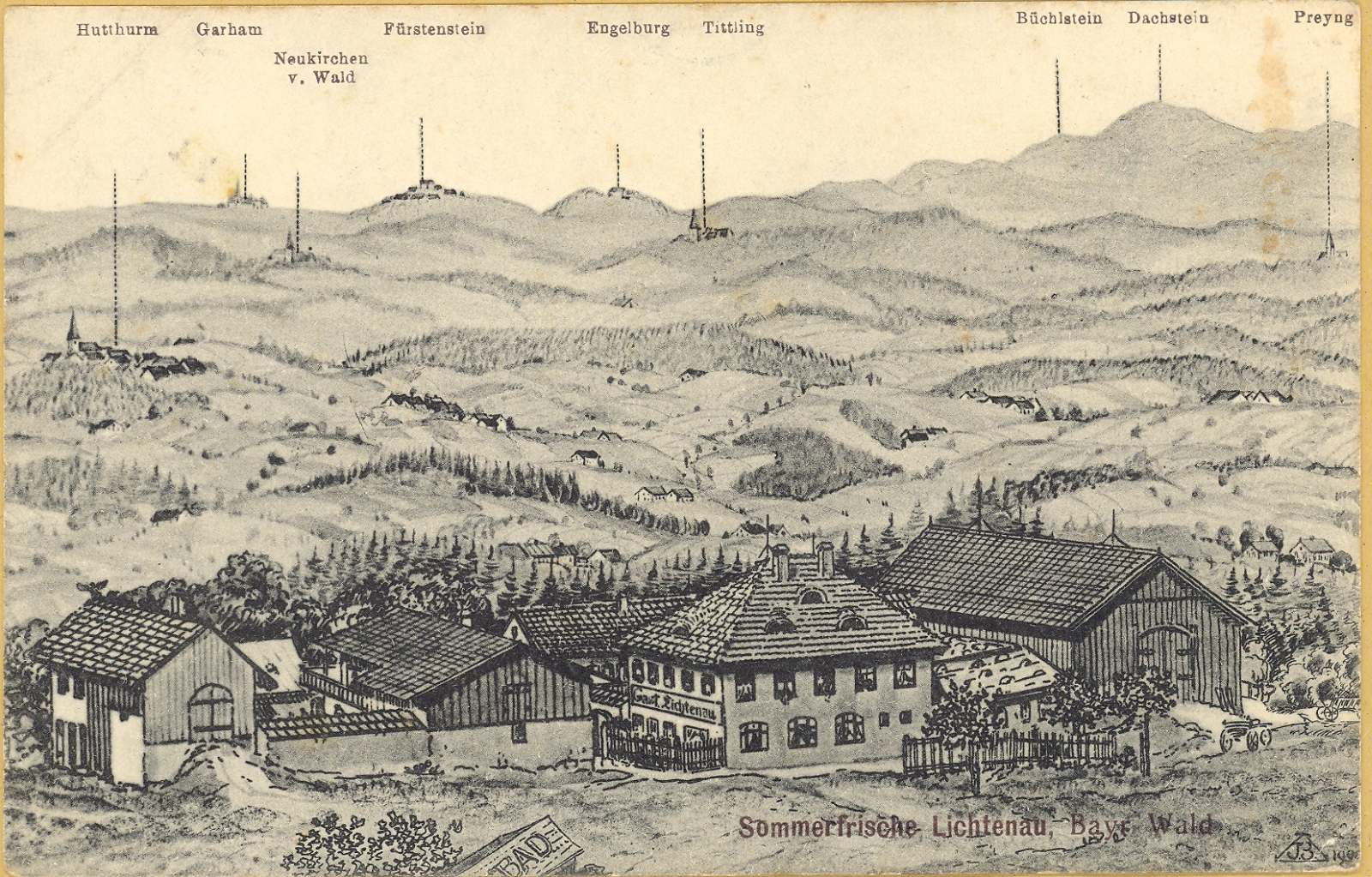 Auf der gezeichneten Ansichtskarte sind die bei guter Sicht zu sehenden markanten Punkte mit Pfeil und Beschriftung gekennzeichnet. Von links nach rechts sind dies: Hutthurm, Garham, Neukirchen v. Wald, Englburg, Tittling, Büchlstein, Dachstein und Prey(i)ng. Die Karte erschien im Verlag Hans Pernat, Spezialhaus für Ansichtskarten, München. Der Alleinverkauf erfolgte durch Franz Stemplinger, Lichtenau.