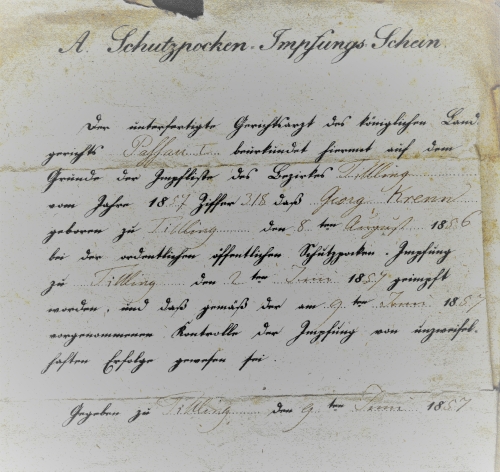 Der unterfertigte Gerichtsarzt des königlichen Landgerichts Passau I beurkundet hiermit auf dem Grunde auf der Impfliste des Bezirkes Tittling vom Jahr 1857 Ziffer 318 daß Georg Krenn geboren zu Tittling den 8. August 1856 bei der ordentlichen Schutzpocken-Impfung zu Tittling den 2. Juni 1857 geimpft worden, und daß gemäß der am 9. Juni 1857 vorgenommenen Kontrolle der Impfung von unzweifelhaftem Erfolge gewesen sei.