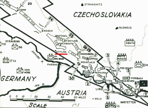 Andere Einheiten der 3. Armee haben beim Vorrücken im sechs Meilen breiten Korridor zwischen der tschechischen Grenze und der Donau, der SALZBURG und BERCHTESGADEN bedroht, TITTLING erreicht, 11 Meilen vor PASSAU an der österreichischen Grenze.
