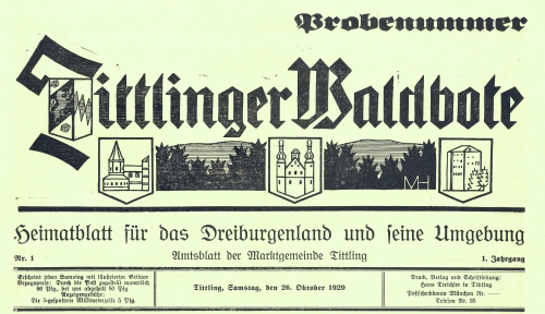Gründung der Lokalzeitung "Tittlinger Waldbote" durch Treichler und Reisinger in wirtschaftlich schwierigster Zeit. Weiterführung durch den Grafenauer Anzeiger.