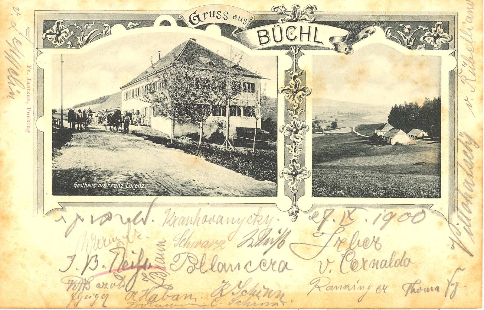 Das linke Bild zeigt das damalige Gasthaus von Franz Lorenz, davor zwei Pferdegespanne und eine Kutsche. Rechts ist eine Ansicht des Anwesens aus Richtung Süden. Die Karte ging an Kooperator Ludwig Kreuzeder in Thurmansbang, der später in Hengersberg und nachfolgend im Damenstift Osterhofen tätig war. Interessant sind auch die Personen, die diese Grußkarte unterschrieben haben; von Zeppelin, von Cernaldo, Villohatsy, von Rübelliano u. a.. Die Karte erschien im Verlag Fr. Jantzen, Pocking.