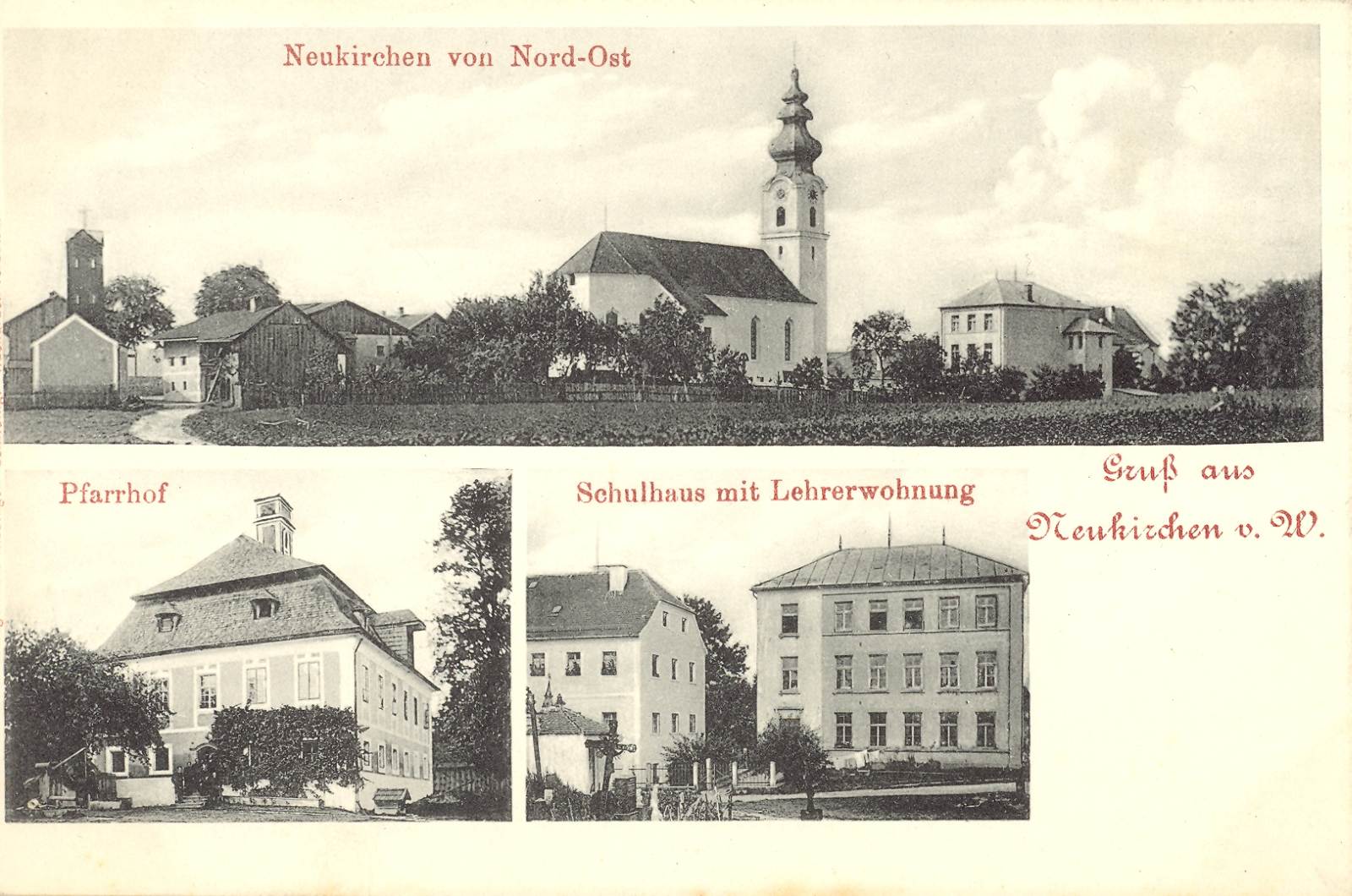 Zu sehen sind eine Ortsansicht von Nord-Ost, der damalige Pfarrhof und das Schulhaus mit Lehrerwohnung.