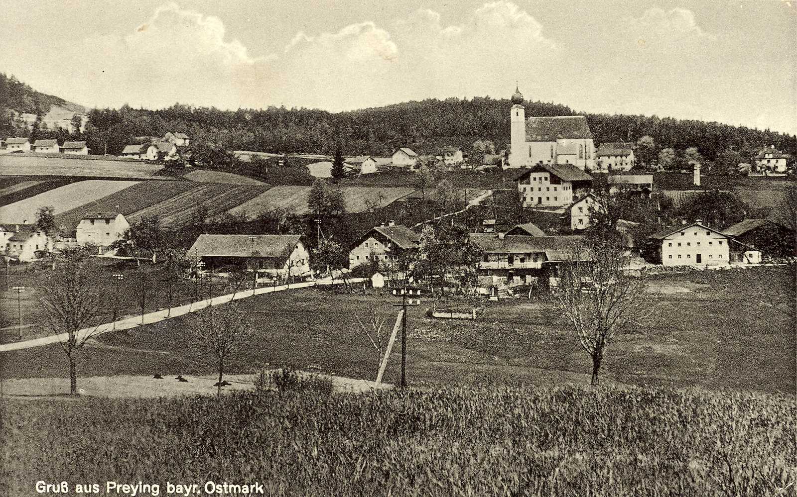 Die Karte zeigt eine Ortsansicht von Preying und eine Detaildarstellung des Gasthauses und der Bäckerei…