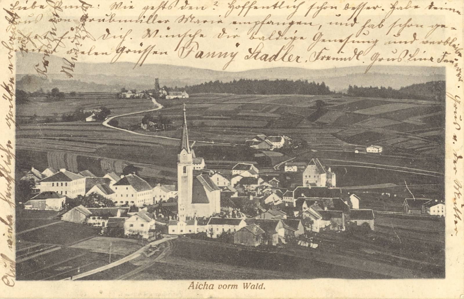 Aicha vorm Wald um 1914. Die als Feldpost am 18. Oktober 1914 abgesandte Karte zeigt…