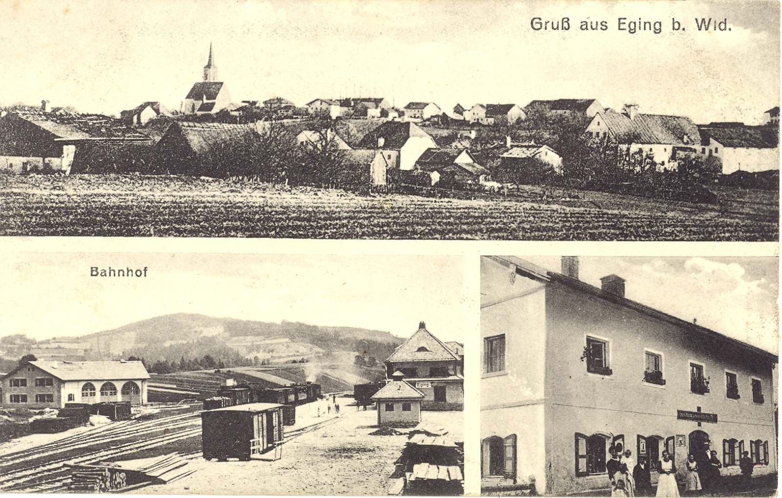 Eine der Abbildungen zeigt den Bahnhof Eging an der 1913 in Betrieb genommenen Eisenbahnstrecke Deggendorf – Kalteneck. Der Verkauf erfolgte durch Peter Schafhauser, Eging.