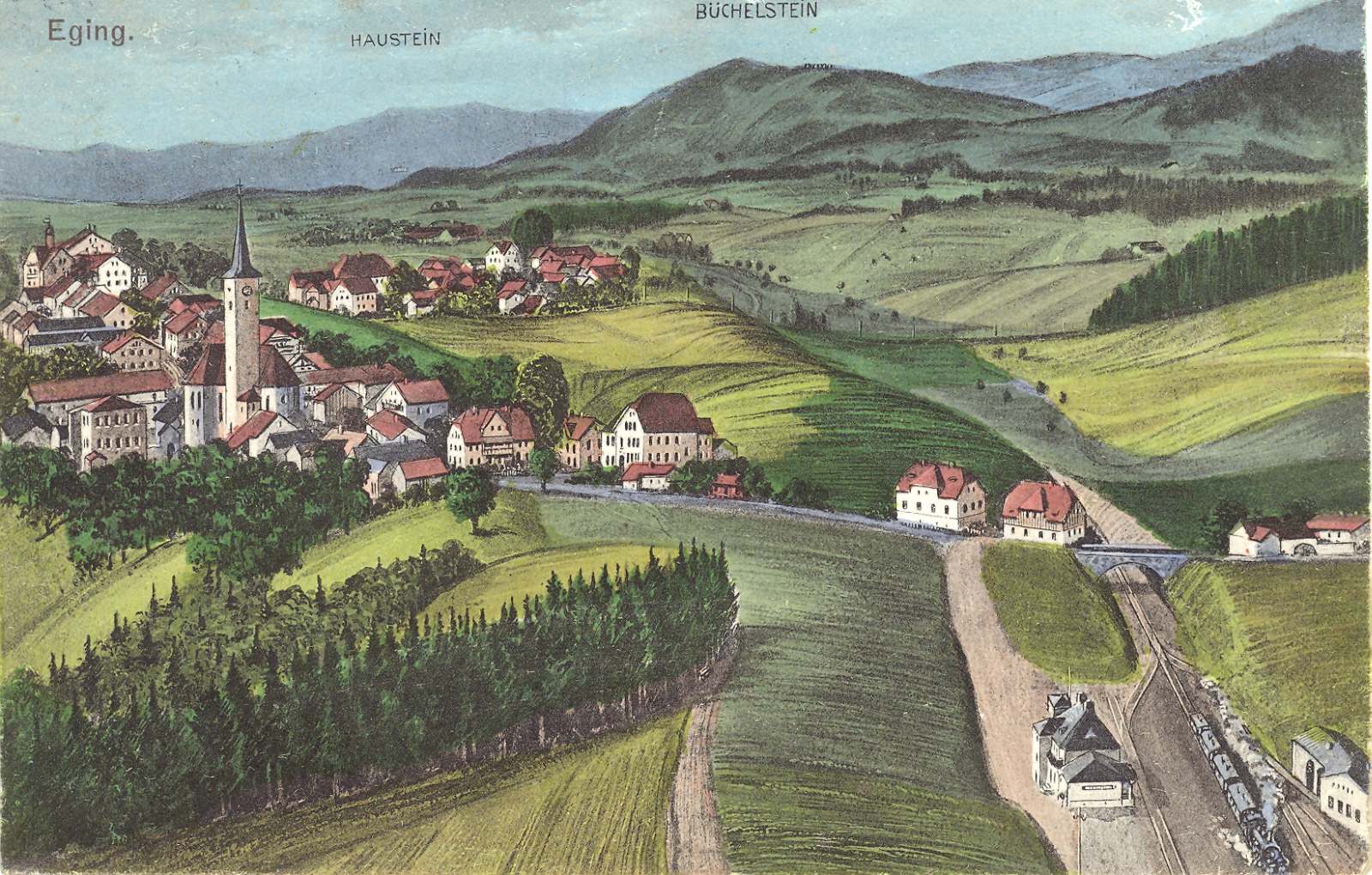 Rechts im Bild ist der Bahnhof Eging und ein Zug zu sehen, der gerade Richtung Nammering/Fürstenstein abfährt. Die Karte erschien im Verlag Kaltenbach, München, den Alleinverkauf hatte Peter Schafhauser, Eging.