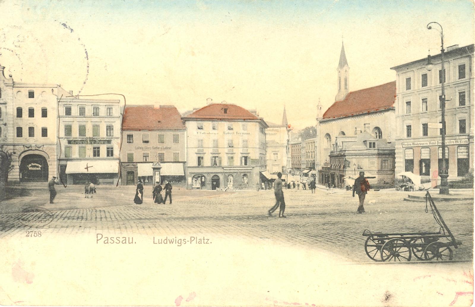 Auf der Karte sind einzelne alte Geschäftsnamen zu erkennen: Cafe Restaurant Wittelsbach, Gebrüder Dorn, Ludwig Sterr, Sattler u. "Lakierer", T. Tuttenberger (?), Robert Bermann und Seiden Moden ... M. Brau (?).