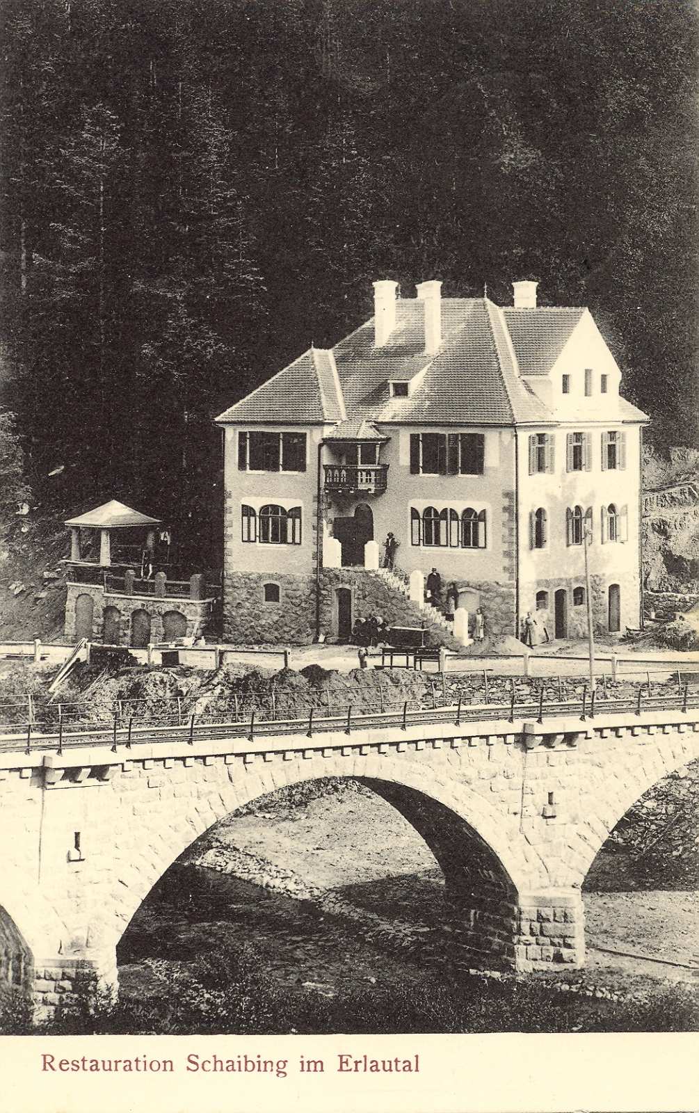Die Restauration beim Bahnhof Schaibing im Erlautal an der Bahnstrecke Passau – Hauzenberg. Die Karte erschien im Verlag Lichtdruck Hofphotograph Adolph, Passau.
