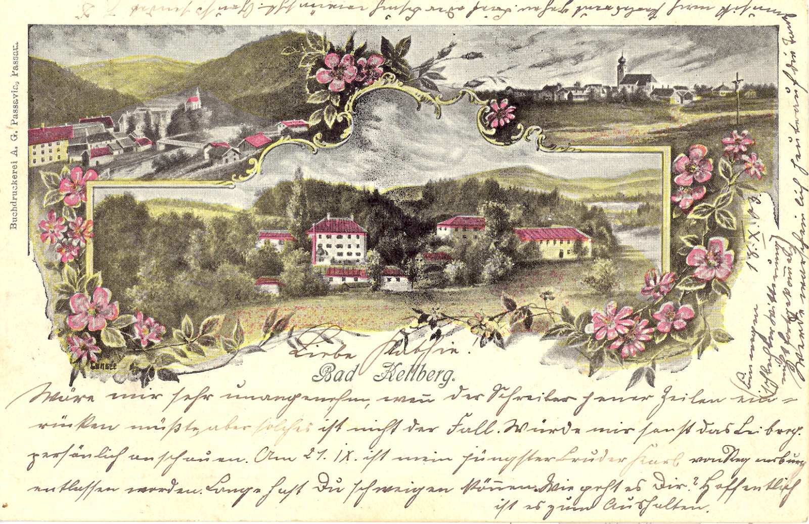 Ansichtskarten waren oft richtige Kunstwerke. Die schönen Abbildungen ersparten dem Kartenschreiber lange Ausführungen über seinen Heimatort oder ein Ausflugsziel. Da um diese Zeit auf der Anschriftseite nur Raum für postalische Zwecke war, musste der Schreiber den gesamten Text auf der Bildseite unterbringen. Die Karte erschien im Verlag Buchdruckerei A. G. Passavia, Passau