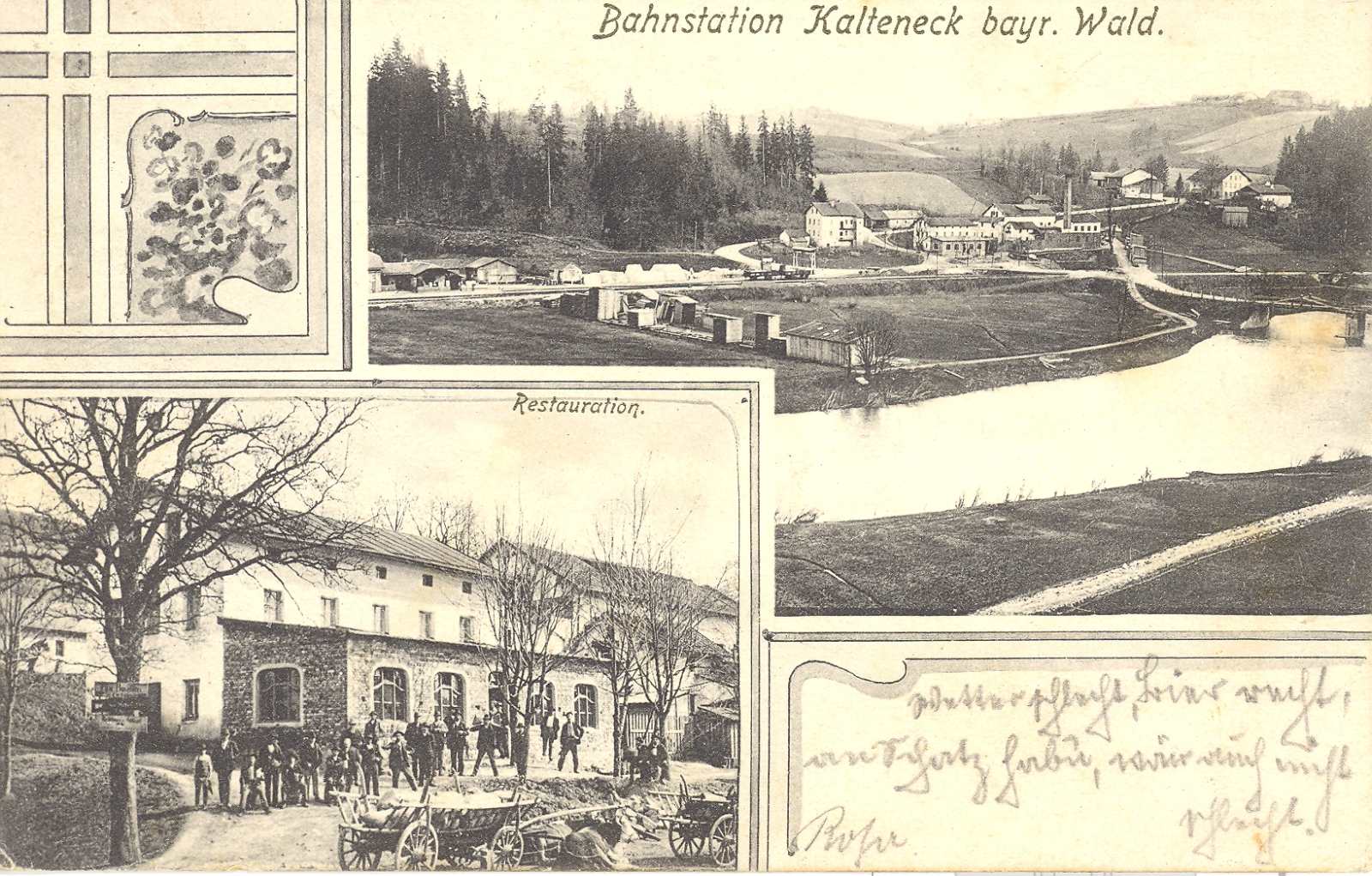 Kalteneck gehört heute zur Marktgemeinde Hutthurm. Auf dem größeren Bild ist die Ilz mit der Straßenbrücke und der Bahnhofseite zu sehen. Die Eisenbahnbrücke für die Linie nach Tittling - Deggendorf war zu dieser Zeit noch nicht gebaut. Auf dem kleineren Bild warten Reisende vor der Restauration auf einen Zug der Linie Passau – Freyung. „Wetter schlecht, Bier recht, an Schatz hab'n, wär auch nicht schlecht“, teilt eine Rosa mit. Die Karte stammt von Hans Schuster, Fotograf.