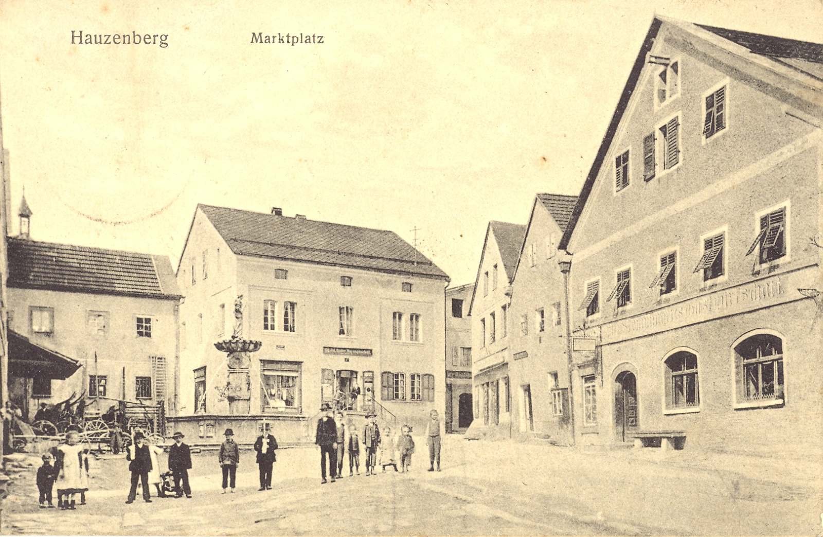 Kinder in Sonntagskleidung haben am Marktbrunnen Aufstellung genommen. Bei zwei Buben handelt es sich um Erstkommunikanten. Wie damals üblich, tragen die Buben Hüte. Die Karte erschien im Verlag Zerle, München.