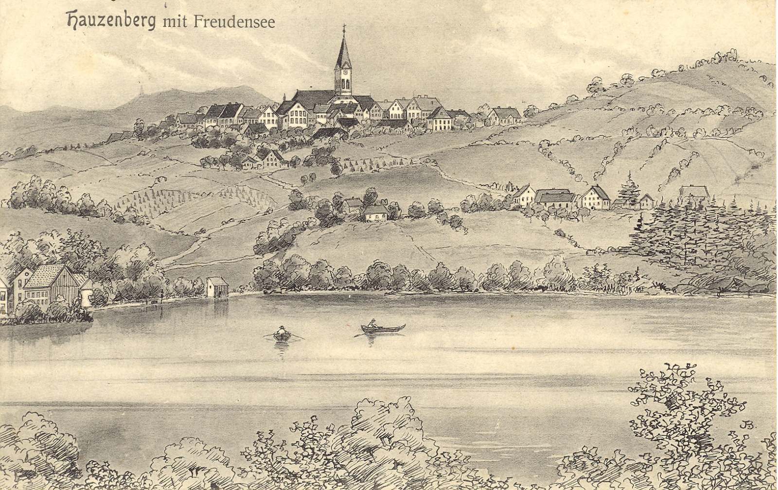 Auf der gezeichneten Ansichtskarte sind die bei guter Sicht zu sehenden markanten Punkte mit Pfeil und Beschriftung gekennzeichnet. Von links nach rechts sind dies: Hutthurm, Garham, Neukirchen v. Wald, Englburg, Tittling, Büchlstein, Dachstein und Prey(i)ng. Die Karte erschien im Verlag Hans Pernat, Spezialhaus für Ansichtskarten, München. Der Alleinverkauf erfolgte durch Franz Stemplinger, Lichtenau.