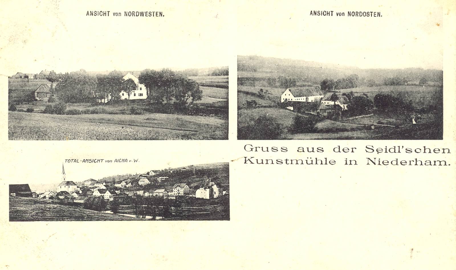 Aicha vorm Wald um 1914. Die als Feldpost am 18. Oktober 1914 abgesandte Karte zeigt zwei Ortsansichten und den Pfarrhof. "Liebe Eltern! Ich muß Euch schnell eine Karte schreiben. Wir haben heute wieder einen Marsch, der drei Tage dauert."