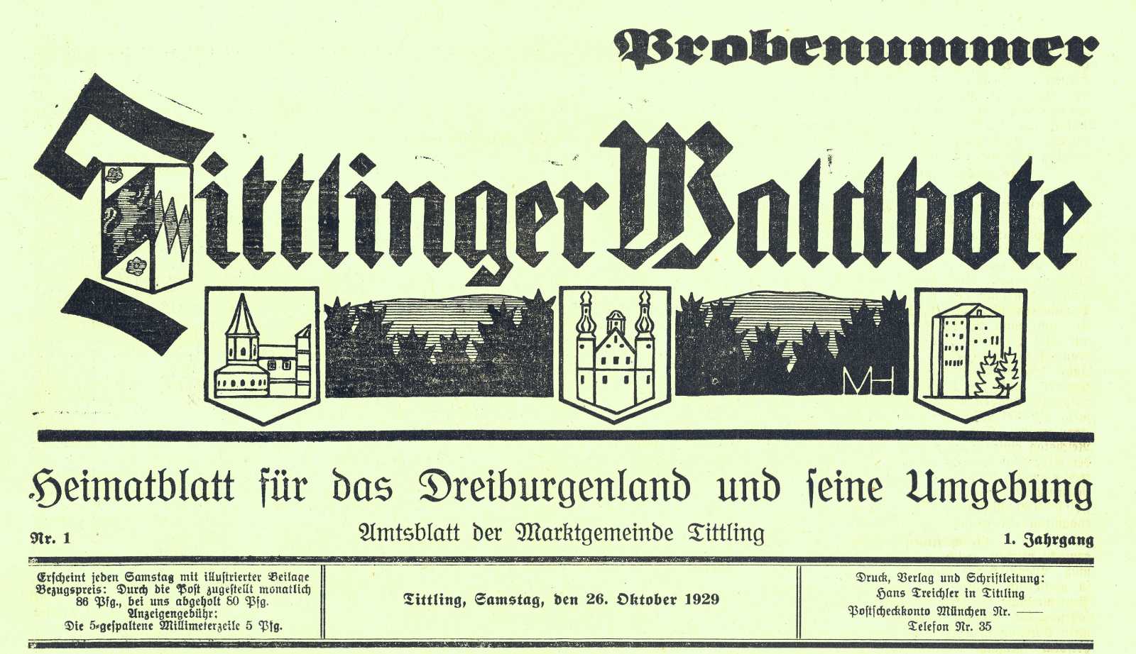 Der „Tittlinger Waldbote“ war eine lokale Zeitung, die erstmals am 26.10.1929 erschienen ist. Ihren Ursprung hatte die vom Buchdrucker und Schreibwarenhändler Hans Treichler und Eisenwarenhändler Carl Reisinger ins Leben gerufene Zeitung in Tittling. Die Herstellung dieser Zeitung mit Welt- und Lokalteil erfolgte im Keller des Wohnhauses von Carl Reisinger in der Herrenstraße (später Hausinger, heute Höltl). Ab Mitte 1930 wurde der „Tittlinger Waldbote“ unter Beibehaltung des Namens und der Aufmachung vom Verlag Morsak in Grafenau hergestellt und vertrieben. Ab dieser Zeit waren die Ausgaben des Tittlinger Waldboten und des Grafenauer Anzeigers nahezu gleich.