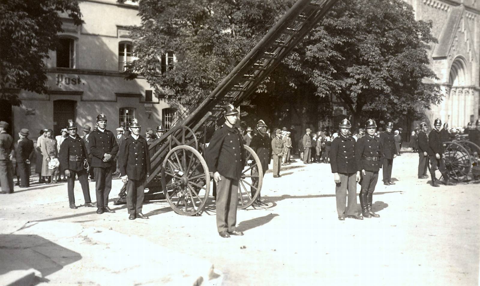 Die Aufnahme entstand bei der Feuerschutzwoche vom 17. bis 23. September 1934. Die Bevölkerung zeigte großes Interesse an den Vorführungen der Feuerwehr.