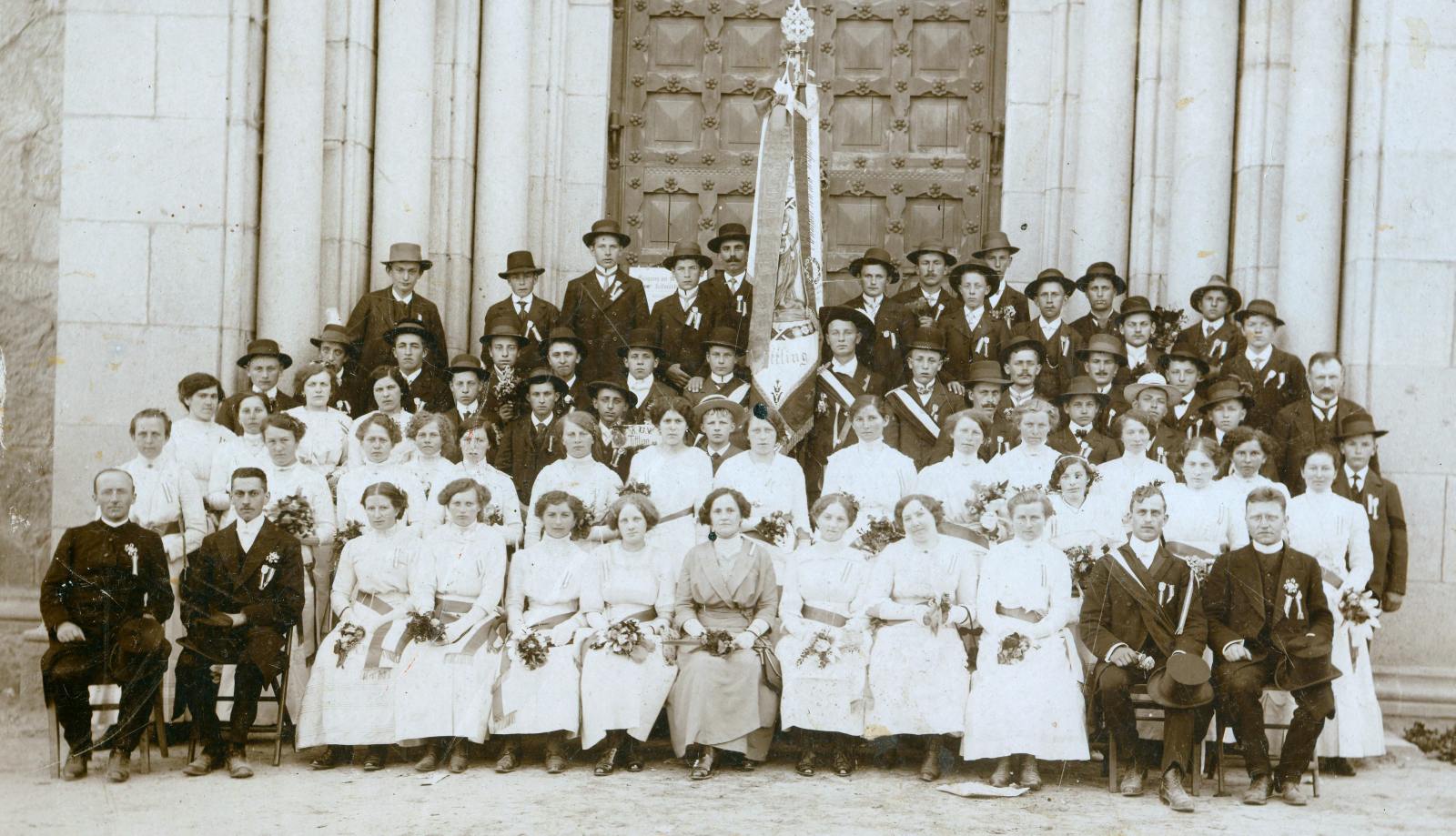 Ein Erinnerungsfoto vor dem Kirchenportal der Pfarrkirche St. Vitus, eingerahmt vom damaligen Pfarrer Matthias Putz (vorne links) und Kooperator Josef Edermanninger (vorne rechts). Das Foto dürfte anlässlich der Fahnenweihe am 28.06.1914 aufgenommen worden sein.